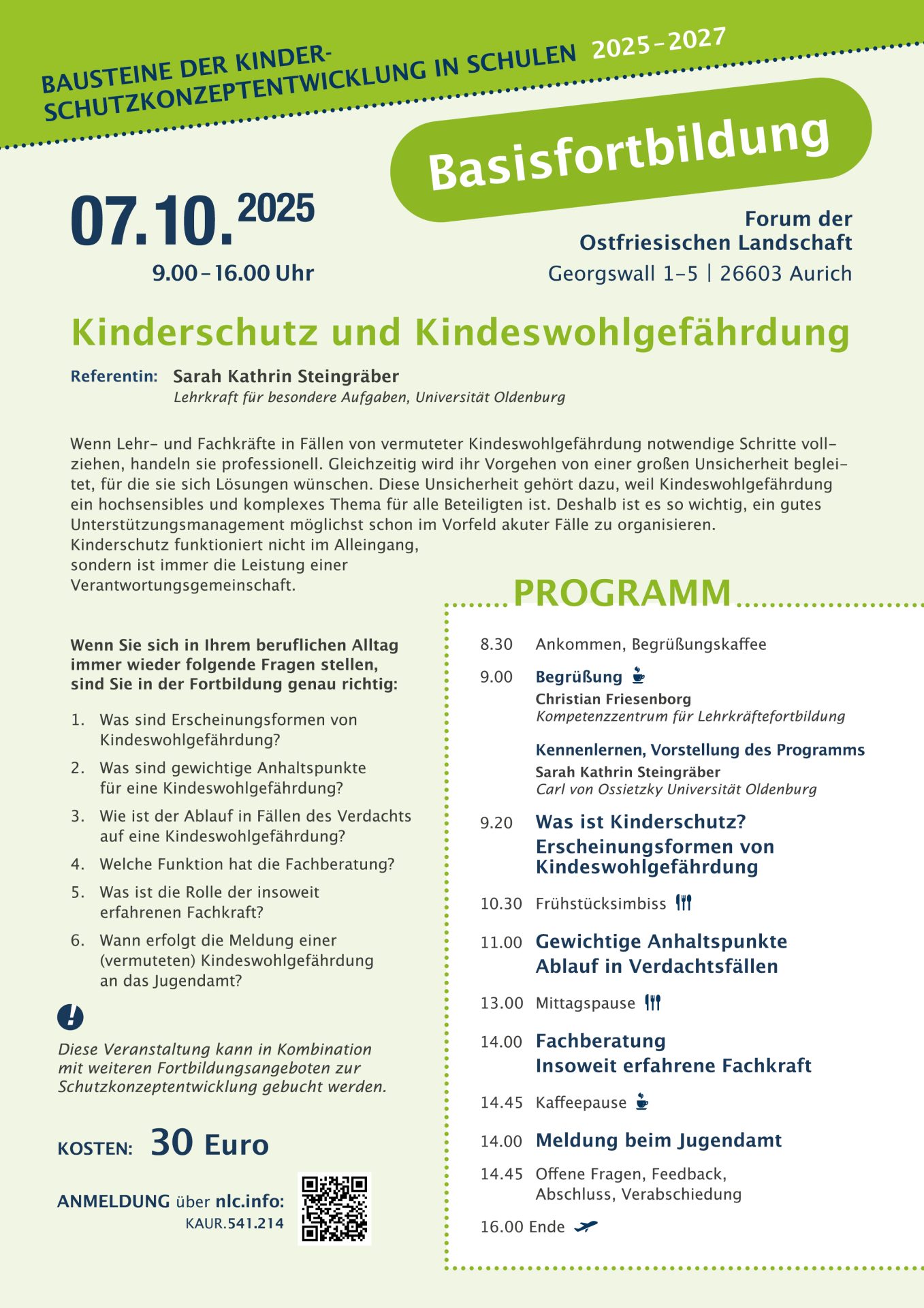 Die Bildungsregion Ostfriesland bietet ab dem 07.10.2025 Bausteine der Schutzkonzeptentwicklung an.